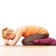 As you wake up from sleep, while still lying on your back, place your feet together with your knees to the side. You want to create a wide diamond shape with your legs. It may help to have pillows placed under your knees and lower back for additional support.